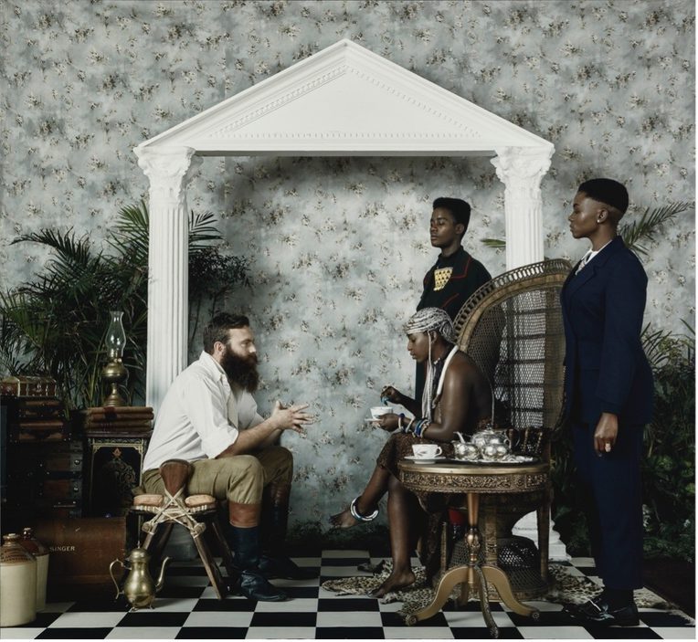 It begins with an inventory of things: silver, china, and the presumption of tea; gas lantern, high-backed wicker throne, Singer (as in the sewing machine); leopard skin, tropical fronds, Corinthian columns; a headdress and a beard; bodyguards. Then they begin to notice stance and stature. Who is supplicant to whom here? What sort of encounter is this? Dr. Livingstone, I presume? We walk the line between Imperial fantasy and Afrofuturism. The title speaks of beginnings, but also of going head-to-head. In this chess game that plays out across black and white territory, we live past and present simultaneously, imagine otherwise.