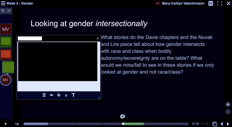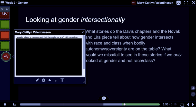 VoiceThread is a cloud-based tool that allows you to upload various different media (PowerPoint slides, Google Slides, images, documents, and more), and add audio/video or text-based commentary to these media. Many universities have a subscription to VoiceThread and integration with their LMS, but if your institution does not have an account, here you can find additional license information. For the lowest cost option, you are allowed one instructor and up to fifty students—more students cost extra. Mary-Caitlyn finds it to be a much more elegant solution for content delivered in a lecture-style format than using, e.g., the native PowerPoint record-to-slide function, which then requires you to upload a PowerPoint file for your students to download. She typically puts together lecture slides in Google Slides, which she uploads to VoiceThread. Once the slides are processed in VoiceThread, Mary-Caitlyn records audio/video narration on each slide, walking students through the important points she wants them to capture or directing them to complete a participation activity by adding a text, audio, or video comment to the slide in question. You can see examples of what this looks like visually in the images below (with student initials, names, and writing blacked out).
