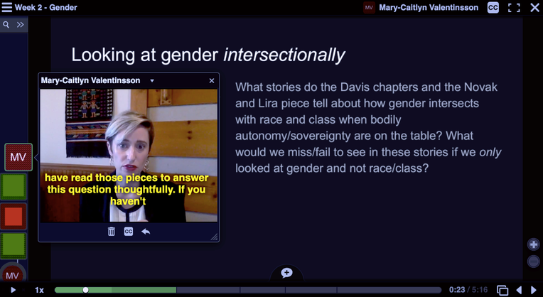 (2) Captions can be tricky to manage. If your university has a subscription, you may be able to request automatic captions from VoiceThread directly. They take about four days to process (so you must make sure to do this before the course begins—which means you also need all your VoiceThread lecture content prepped ahead of time). Mary-Caitlyn finds them to be of middling quality, but they can also be edited by hand once initially processed. (You can also, of course, upload your own caption files to each slide narration.)