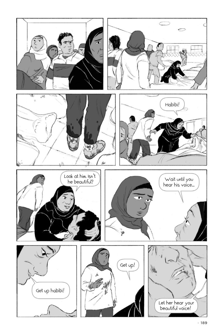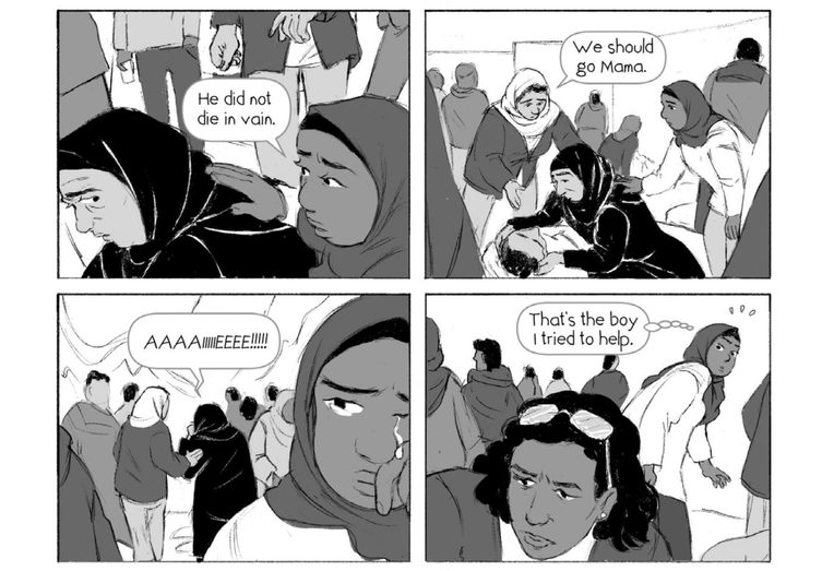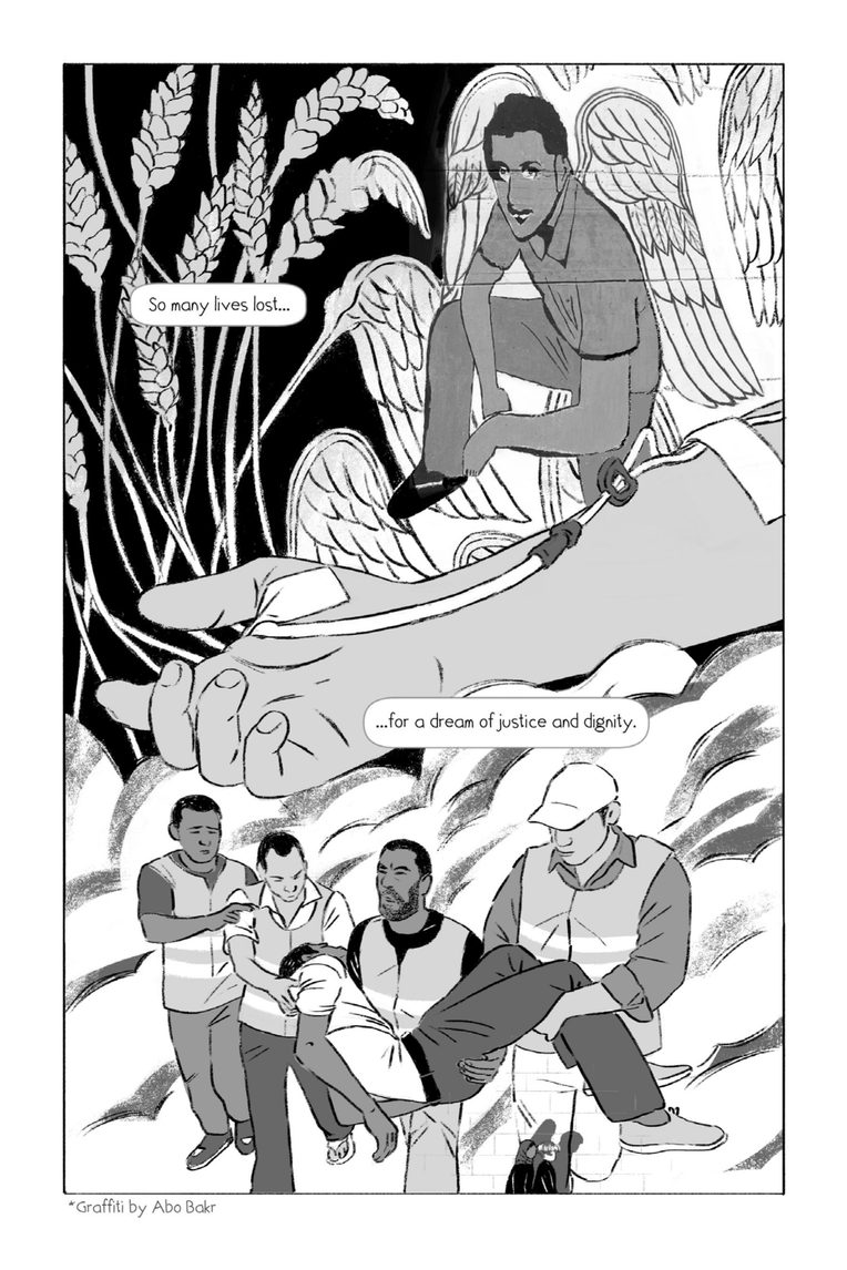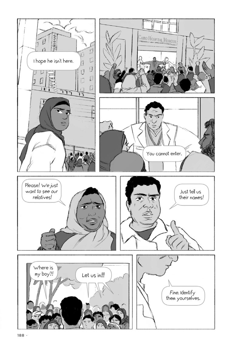 In the following pages, we recreated a scene in the morgue based on Mossallam’s own account painstakingly described in her June 2011 article. On January 29, 2011, the day after the deadly “Friday of Rage,” Mossallam had stood outside of the morgue at the university hospital in Alexandria, joined by the families of the missing and the dead, waiting to find their loved ones. The morgue administrator barred people from entering and refused to share any details about the bodies inside. Moved by grief and rage, the families pushed their way through and began pulling sheets off of bodies. Mossallam describes a harrowing experience with a mother who finds her son dead. The dialogue presented in Lissa is all taken verbatim from Mossallam’s published account: