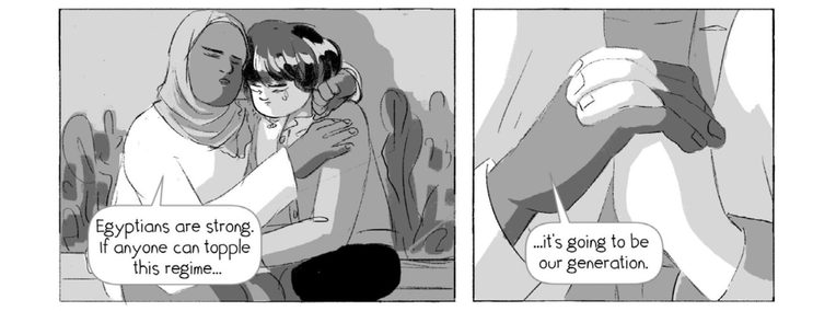 Incorporating Mossallam as a character in the graphic narrative allowed us to cite her evocative writing and foreground her important revolutionary work and her commitment to public scholarship.