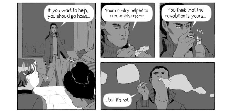 Second, we revealed the sensitivity around these questions of positionality, so that readers could also ask questions about who should be where, without having to provide all the answers. We created a scene in which Layla’s brother Ahmed vents his suspicion and resentment of Anna’s presence. While watching Layla and Anna go through photos of missing persons, Ahmed questions Anna’s place in the revolution and calls out her positionality as the daughter of an American oil executive. Labeling Anna as someone whose family profited from extractive and imperialist policies in the region, Ahmed suggests that Anna is in many ways complicit in the economic inequalities that pushed so many to risk death in pursuit of dignity and justice. The multimodality of the comic fiction form made it possible to effectively layer these multiple perspectives and critiques in a single scene, while maintaining the authorial voices of Egyptian revolutionaries.