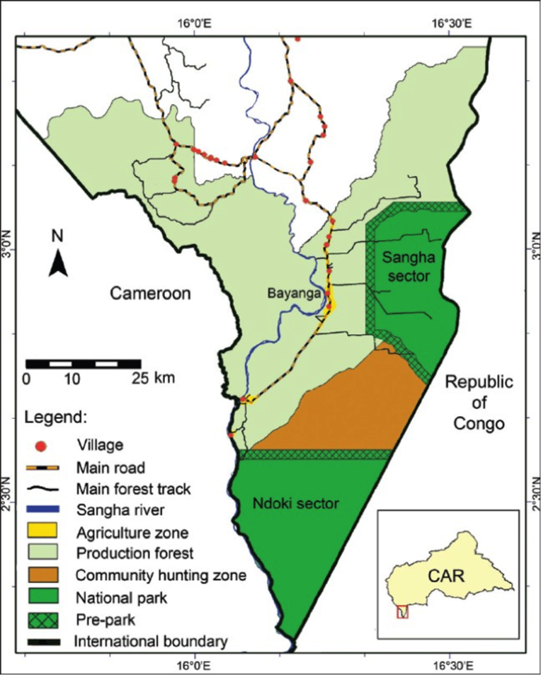 Overall, the RDS, with its particular geographic isolation, has been a place of relative security for humans and animals alike. It is one of the last strongholds of western lowland gorillas and forest elephants in the Congo Basin. The human population of the RDS is settled across seven villages, Bayanga being the largest. The primarily migrant population of the RDS contains ethnic groups from all regions of the CAR, as well as many other countries in the region and further afield. The fluctuating socioeconomic history of the RDS has created a complex web of negotiated natural-resource use and extraction regimes involving the local conservation project, a foreign-owned logging concession, and the reserve population. Conservation work has entailed tension with these other resource-use modes, but integrally protected wildlife species remain.