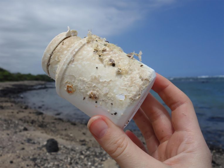 The materials of human design, then, are never-finished processes. Plastic endures as part of, rather than existing outside, processes of entangled becomings-with. If Kamilo is a landscape altered by plastic, the plastic itself is likewise transformed by movement, changing shape and even chemical composition as it travels. It breaks down in the sun and waves, leaching and accumulating synthetic toxins known by ominous acronyms—BPA, DDT, and PCBs all stick to plastic surfaces. Plastic even provides mobile homes for marine life. The white xylitol gum container I pull from the tide line had attracted lacy communities of bryozoa, tiny filter-feeders that now live and die with plastic.