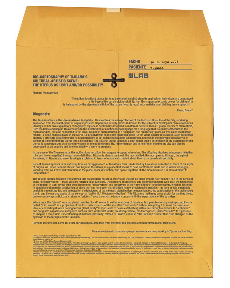 In "Bio-cartography of Tijuana's Cultural-Artistic Scene," a conceptual and cartographic piece, I set out to think of the gesture of mapping an urban landscape as a diagnostic act. With a sense of irony toward the curator’s medical gaze and cannibalistic form of care, I perform here the role of an imaginary gynecologist diagnosing her patient named Tijuana. Mediated through the materiality of an ultrasound of my own uterus—a gendered and highly contested scientific technology that monitors fetal growth and developmental stages—my medical report is a provocative reading of the parent-child relationship between curators and artists in Tijuana and a critic of a new “localized” nationalism.