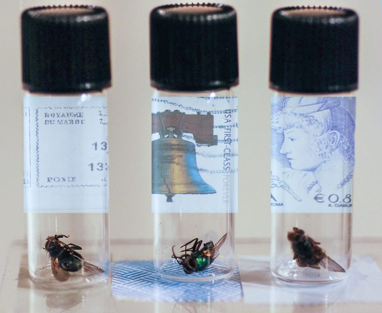 "MI-LIEUS" is a collaborative multimedia project that reflects on the persistence of taxidermic principles in contemporary scientific denominations and on national cultures. Three blue bottle flies were collected, mailed from Morocco, Italy, and the United States, preserved and indexed via corresponding stamps to their national, geographic, and ecological provenance. Iconic images of various national cultures blend with the organizing principles of zoological taxonomy, pointing to the isomorphic link between culture, nation, territory, and life-form. The three flies installed in this piece belong to the same family within Linnaeus's classificatory system [Blue bottle fly or bottlebee: Species Calliphora vomitoria, linnaeus, 1758] and are found in most areas of the world. MI-LIEU problematizes the intersection of natural history and museum in the age of the territorial nation-state and colonial expansions in the nineteenth century. Specifically concerning the nationalist/colonialist habit of classifying insects and the Cultural Other. Both nationalist and colonialist science rely on taxidermy as a political technology. The etymological association (Calliphora vomitoria) of this specific family of flies with corpses and vomit underscores the vitalist ontology, the logic of life and death, that underpins the rapport between colonial science and the nation-form. MI-LIEU "resists" this vitalist ontology through its playfulness with scale, thereby establishing a contrast between the monumentality and exceptionality of nationalist symbolism and zoological taxonomy and the miniature-like size of ordinary flies. Scale ultimately blurs the boundaries between the organic and the inorganic, between life and death, frustrating the political vocation of the nation to give life to the forms that live on its territory.