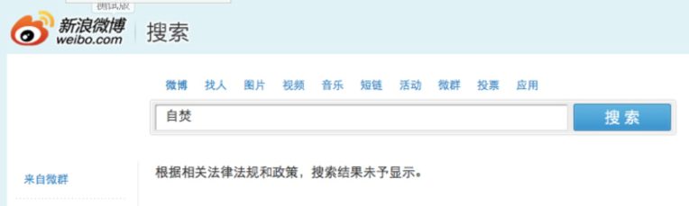 For example, the following screenshot shows how a search on the Chinese microblogging site Weibo for ‘self-immolation,’ 自焚 zìfén, yields no results "due to relevant laws."