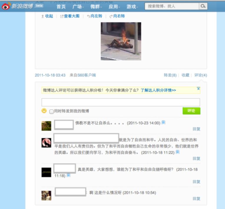 [2] The term 自焚 zìfén was blocked from Weibo for a substantial period of time but at the time of writing (February 28, 2012), the term had since been unblocked. However, search results yielded were not Tibet-related.
