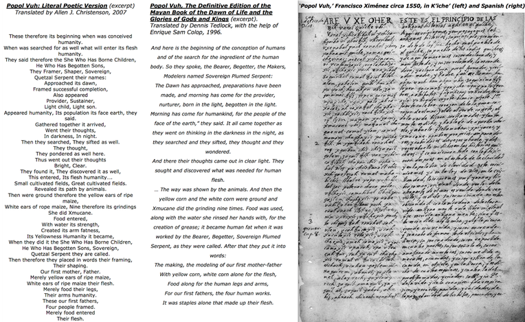 They had learned to write from missionaries, who destroyed their codices and forced Christian prayer upon them. They were told to translate Christian gospel into K’iche’, but, as Dennis Tedlock (1996) tells the story, they used the skill of writing for another end. A century and a half later, a Spanish friar read (or, more likely, stole) their secret manuscript and copied it, adding a Spanish translation. It is his writings that have lasted to the present day.