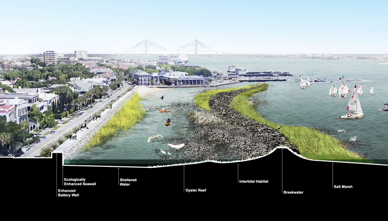 With abundant oyster reefs, emerging marshlands, a softly curving grey stone breakwater, and abundant space for kayaking and fishing, who wouldn’t want to make “A Return to Oyster Point” a reality? This attractive rendering, designed by a team of local and national landscape architects and engineers, proposes building storm surge protection for one of the wealthiest neighborhoods in coastal Charleston, South Carolina by combining layers of green infrastructure with an extended and heightened seawall.[1] The design for a “living breakwater archipelago” focuses on the Battery, a neighborhood that white settlers referred to as “Oyster Point” for the Native shell middens found at its tip. Before their forced removal in 1672, this area was home to the Etiwan people, who today form part of the state-recognized Wassamasaw Tribe.[2] The designers suggest that their multispecies protection method could represent a return to the ecologies of this past moment of white settlement, while most importantly providing protection for the future of rising tides—a mode of coastal planning combining imaginaries of white nostalgia with ecomodern[3]