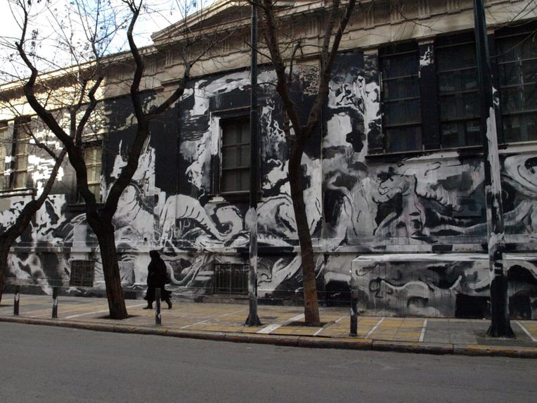 The Polytechneio—the old neoclassical complex of the National Metsovio Polytechnic University on Patission Avenue in Athens—is a charged space, a topos of Hellenism (Leontis 1995, 18) for most Greeks. For decades, its exterior walls have been covered with banners, posters, and graffiti, while protesters frequently occupy its inner spaces. The consistent message of the buildings’ serial extracurricular uses has been the resistance of freedom-loving Greeks against political oppression. This has been the most common reading of the buildings’ occupations, at least by people positioning themselves on the progressive half of Greece’s broad political spectrum. Then one day in March 2015, a huge back-to-back, black-and-white graffiti piece claimed the two most visible external walls of the Polytechneio building on the corner of Patission and Stournari Streets with an inscrutable message.