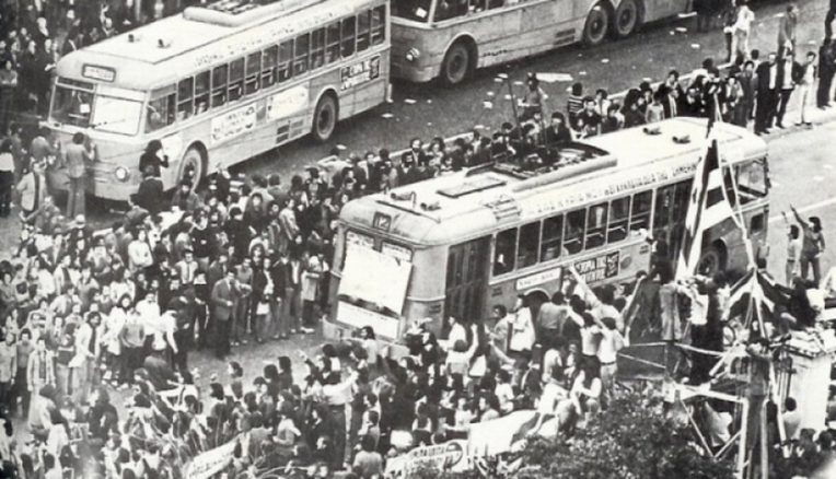 4. This leads me to my fourth and last point. Graffiti dwells in a volatile context. Each piece of graffiti entering public space becomes a layer in the palimpsest of the city. One day it overwrites something and so transforms a wall, as the graffiti transformed the Polytechneio complex; the next day it may be buffed or overwritten. This does not mean, however, that it is made to disappear. As a layer in the palimpsest, it enters into the site’s history, to be recalled on some later occasion in another medium, another act (e.g., Eleftherakis 2015). My interest in the graffiti was piqued after it was buffed, and eight months after its vanishing it is still etched in my (computer’s) memory. As I write this, a Google search for “Polytechneio” pulls up historical images of the 1973 occupation, including one of buses stopped in front of the complex’s gate.