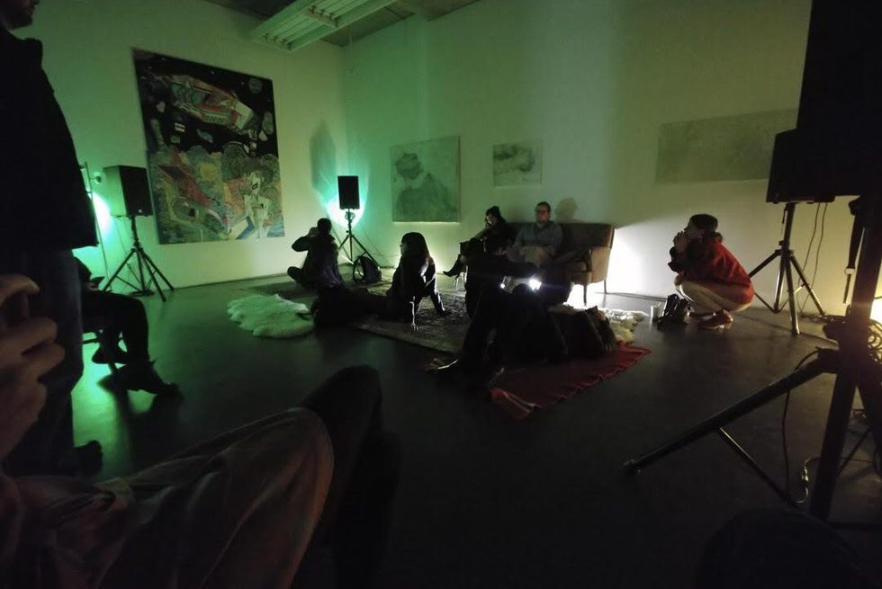 [9] [Jay:] “Ordinary Schizophonia” was first exhibited on Thursday, November 21, 2019, at Dynamo Arts Association in Vancouver. After many months of sharing our field recordings, experimenting with new workflows, and ending with a four-channel audio installation, it was time to put the piece on loop and watch it come to life in the space. We had a great time. I was in the gallery for sixteen hours straight without going outside. Worlds converged, very little theoretical talk. Attendees ranged from AAA conference-goers to members of various Vancouver art communities to curious passers-by. A few hours of deep listening in the beginning - attendees sitting or sprawling attentively, sometimes with notebooks in hand, sometimes lying on the floor, or with faces close to the speakers - gave way to many hours of generative comradery. The piece looped in the background of the joyous and messy integrations of communities, our genealogies of listening converging, our bodies floating.