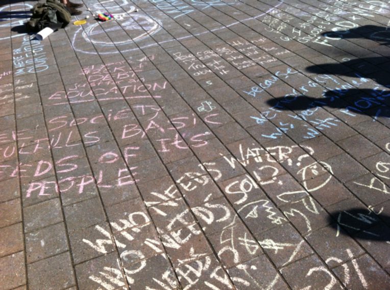 With all the trappings common to other Occupy encampments—the People’s Mic [1], the establishment of a consensus-based assembly for the encampment, the provision of an infrastructure (tents, food, medical supplies, etc.) capable of supporting the occupiers for an indefinite period of time—the Occupy NS encampment began its life in a spirit of frivolity as much as resistance. Drumming circles, spoken word performances, chalk drawing, dancing, and the People’s Mic allowed a diverse group of occupiers to voice their grievances, aspirations, and motivations. In a series of impromptu interviews I conducted with those in attendance on the first day of the occupation, most participants were enthusiastic, but some had a much dimmer view of Occupy’s capacity to challenge and transform power relations at the level of everyday lived realities.