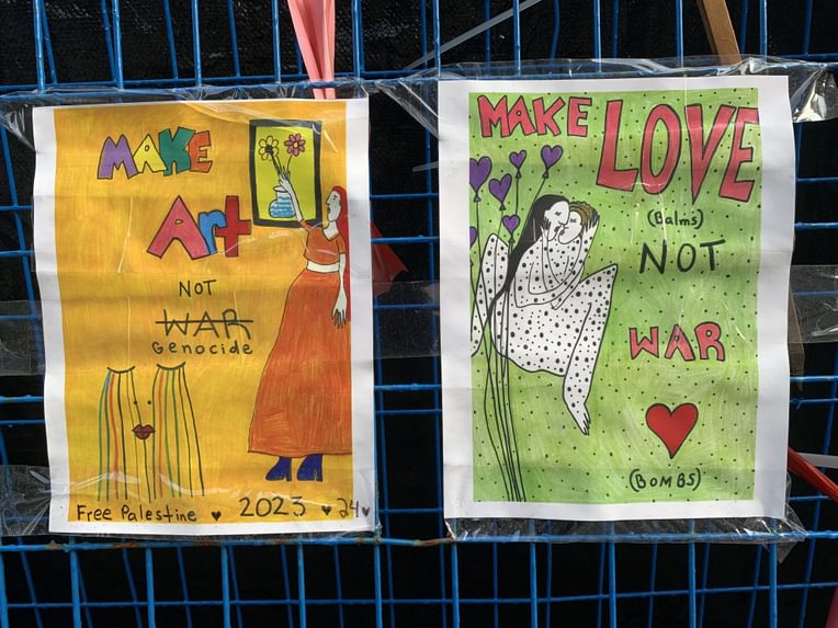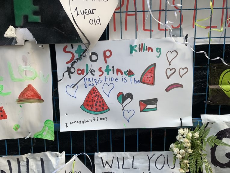 What follows is a photographic essay. I am a historian and, as such, I am drawn to the potency of traces, texts and things humans leave behind. As the People’s Circle for Palestine was birthed, as it grew and as it was eventually dismantled, the outer part of the fence that surrounded it was turned into a living and breathing canvas on which a wide array of expressions of solidarity, activism, and decolonial care were attached. Every day I would walk or bike by, I would see new banners, new drawings, paintings, photographs, stickers and graffiti. I documented the life of the canvas-fence until the last day of the camp. It now lives on as a photographic archive, which complements the material archive created by the student leaders, who carefully archived the larger items during the dismantlement of the camp.