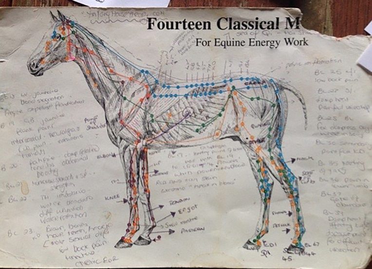 Healing goes in both directions. Practitioners maintain their animals’ health with weekly shiatsu massage, which relieves blockages in the flow of electrical impulses. Such blockages are chronic symptoms of the physical and emotional stresses of therapeutic work. The practitioner shows me her diagram of equine meridians, telling me, “We all share the same system.” Intent can be transmitted through bioelectric current, she explains: “They tell me when they need a massage. They focus their attention on me and I know.” At Epona, horses are electric. Energy is a ubiquitous vital force, the substance of a network of bioelectrical impulses that connect therapists, clients, and horses in currents of communication, intent, and healing.