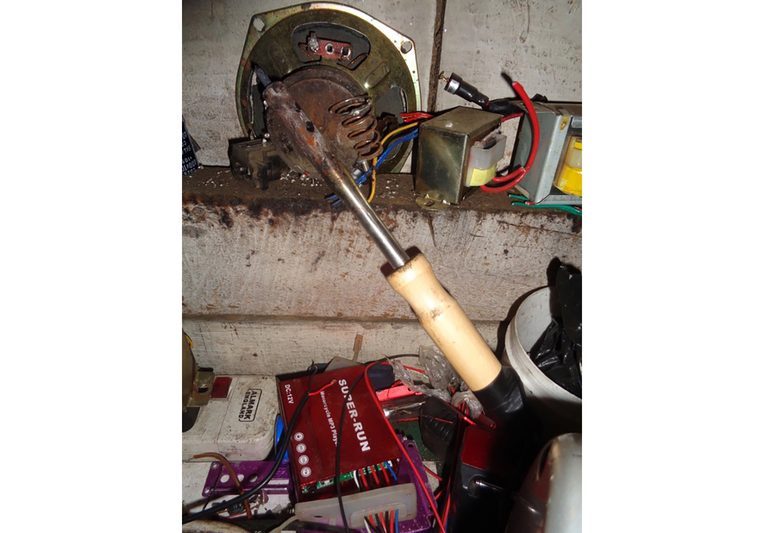 Without a battery, the iron must be tethered to the grid at all times. So, with another job done, the technician weaves the iron over and under cables, in front of objects and behind them, moving his body in order to return the soldering iron to its stand.