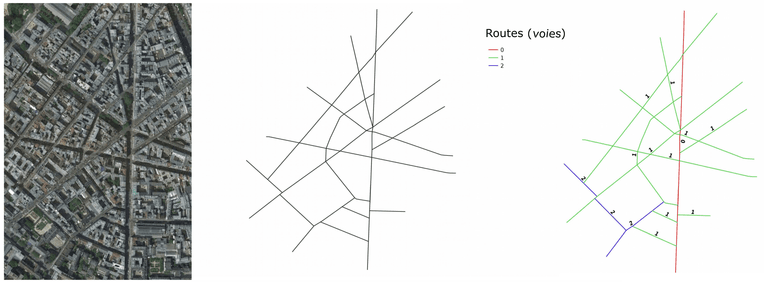 It is important to talk about route (voie, in French), not street (administrative entity defined by a name). The notion of route that we specifically reconstruct to allow automatic calculation afterward, is continuous, made up of elementary segments (between two intersections), and as perfectly aligned as possible (we choose the smallest angle at each intersection). As in work on collective stampedes, the individual who advances in a given general direction prefers to move through any open space available to them as near as possible to that direction (visibility). We therefore maintain the geometry (the angles formed by the routes between each other) in addition to the topology of the network, which are the essential parameters in human practice. Herein lies the originality of our method: previous approaches to urban road networks overlooked this anthropological reality of the path and the route.