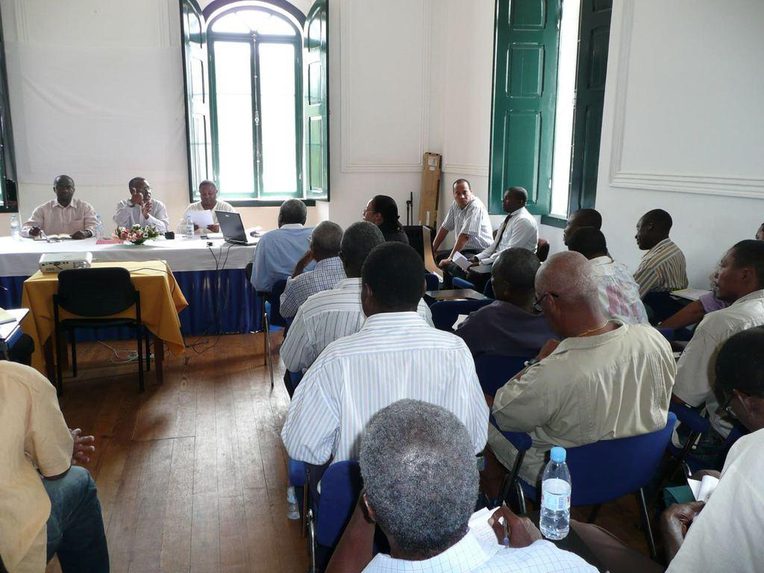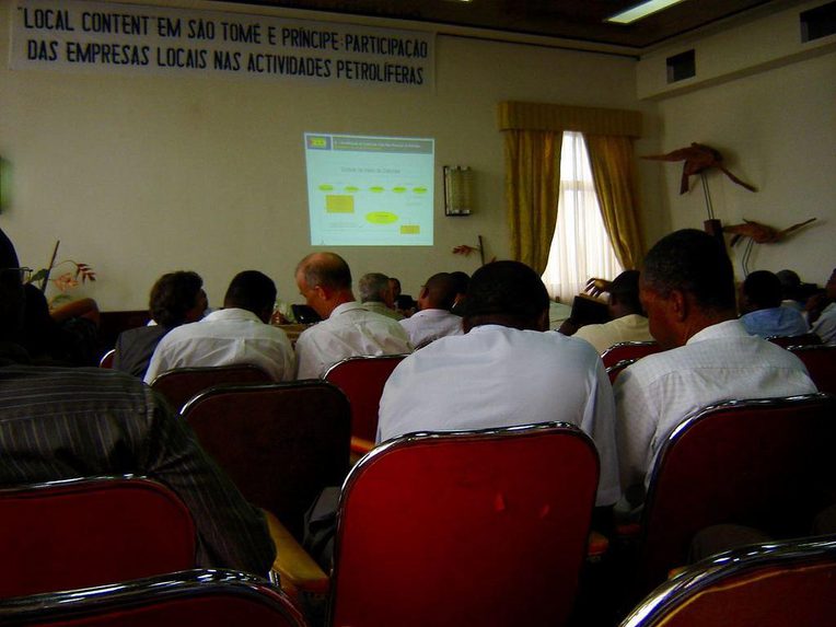 The seminar where this photo was taken presented the results of one of the local content studies for STP. Consultants from abroad revealed that, at present, the country lacked the human resources, infrastructures, and capital necessary to ensure meaningful local participation. However, they also suggested that with appropriate state policies, specialized training, and improved skills among the local business community, local content could be made a reality in the future. I imagine that the gentlemen in the photograph were debating the possibilities for this to happen. One of the two men in the foreground is Aíto Bonfim, a respected lawyer who has also provided advice to the Santomean government. Bonfim has much personal experience of the slow unfolding of oil exploration in STP. Indeed, he was among the first people charged with reviewing proposals for oil exploration following Santomean independence. I had a number of long, fascinating conversations with him about the various reasons that may have led to the continuous deferral of oil. The two men in the background are employees of the oil company Chevron, which was, at the time, operating in Block 1 of STP’s joint development zone with Nigeria. One of them is Tim Parsons, the expat representative whom I also mention in my article. Tim was extremely generous in sharing his knowledge about the oil industry with me as well as his critical understanding of what was going on. He was doubtful of the somewhat misleading claims made by the consultants in this seminar regarding STP’s local content potentials. Given STP’s insularity and the extensive availability of industry-related services and resources elsewhere in the region, he felt it was unlikely that Santomean service providers could become sufficiently competitive.