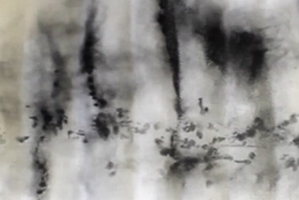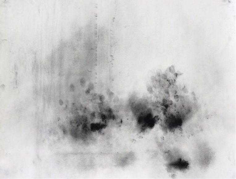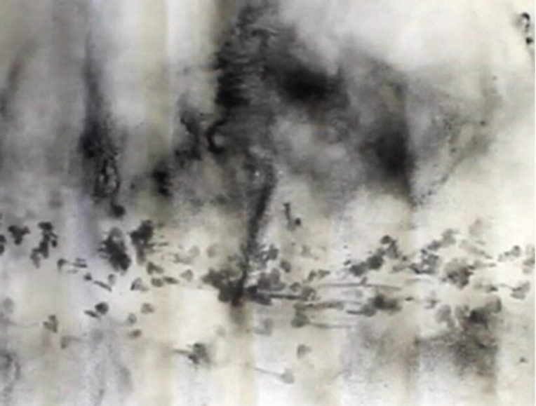 The Japanese perception of the body is not fixed, reality is apprehended as changing and is recognized in the spectacle of clouds (Billeter 1989, 183). There is also a very strong correspondence between "man" and "nature" in Asian culture, most evident in its painting practices in which the clouds hold a special place. Between the two poles of mountain and water, earth and sky, that constitute reality, the Void circulates and is represented by the cloud. This Void is not an inert presence but is traveled by wind, the vital breath that links the visible to the invisible and fuses mountain with water. It at once condenses water into a cloud and embraces the mountain with it (Cheng 1979, 22). The cloud is a world of mutation, a model of metamorphosis, anamorphous deformation, the dissolution of delimiting contours, and the essence of the atmosphere. The mutating cloud of charcoal in Re-sounding Movements becomes significant as the incarnation of process in drawing. If the cloud is a privileged conductor of reverie and imagination, according to Hubert Damisch, "it is because it contradicts the order of delimitation and contour and rather appertains to matter in that it aspires to form" (1972, 55, emphasis added). It is the thickening of atmosphere as much as it is corporeal, “obeying, like any other body, the laws of movement and weight” (Damisch 1972, 217, my translation).