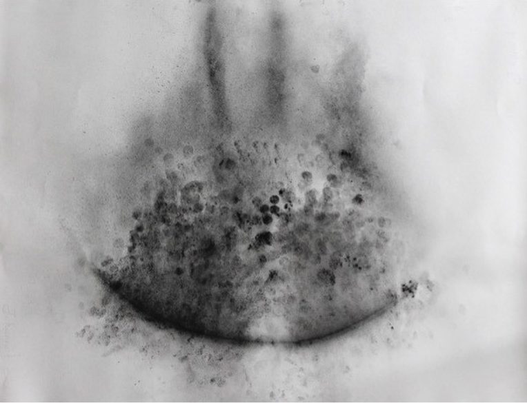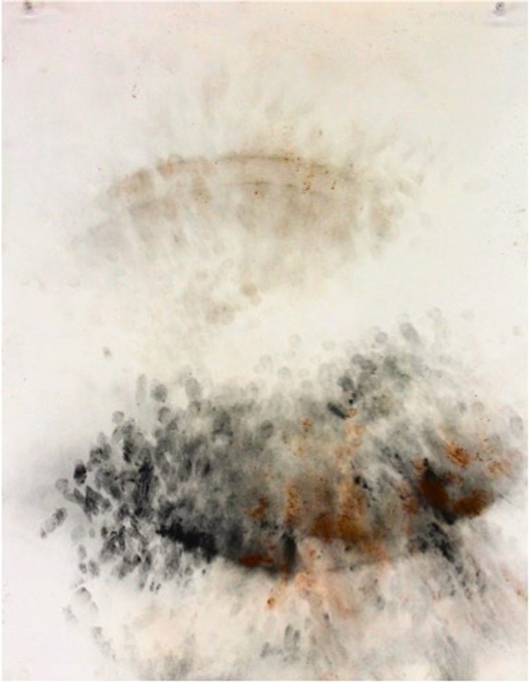 The series of collaborative drawings and videos (involving the percussionist Michel Bonneau and me) attempts to seize the flow and resonance of sound, tracing the ephemerality of the musician’s gestures as he improvises in the interval of rhythms and their corporeal-material manifestation. Charcoal (and pigment) powder was sprinkled onto resilient surfaces of paper that were loosely stretched over various percussion instruments. (Different colored natural pigments were explored for their distinctive qualities of weight and volatility.) The musician then improvised with these instruments, leaving traces of rhythmic forces as they responded to the thin resounding membranes and coalesced in the space in-between volatile charcoal powder and sonorous reverberation (images 1–2, video 1). The fingers, as Tim Ingold (2015, 109) points out about the cello player, "show up simultaneously in two quite different ways, at once corporeal, in the haptic space of performance, and as phantom, in the atmospheric space of explosion." Here, "sound wraps around [fingers, palms or mallets] forming eddies in the process. Every eddy is a center of auditory awareness" (Ingold 2015, 108). Re-sounding Movements exposes the haptic in the optical and auditory as corporeal forces carry the charcoal in the air, flowing, fluctuating, and fusing over the interacting membranes of paper and goat’s hide. A smooth space emerges, "occupied by intensities, wind and noise, forces, and sonorous and tactile qualities" (Deleuze and Guattari 1989, 479). It is a "nomadic absolute that is one with becoming itself, with process. It is the absolute passage, which in nomad art merges with its manifestation" (Deleuze and Guattari 1989, 494). Smooth space is continually being traversed and transformed by the striated space of markings (or fingerprints) on the paper that punctuate and fix the charcoal to the surface while simultaneously propelling it above. Striated space is at once immobilized and dissolved, enabling smooth space to develop in the process; nomad space and sedentary space coexist in their formation. The process of coordinated forming that is played out between vital body, sound, matter, and air embody a temporal experience that is amorphous, heterogeneous in its continuum, and haptic; it is an atmospheric time, perceived in the attunement of attention and response to rhythmic relations.