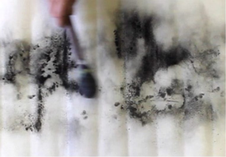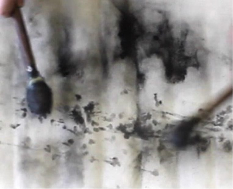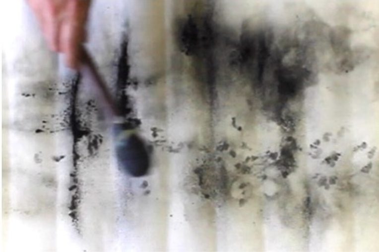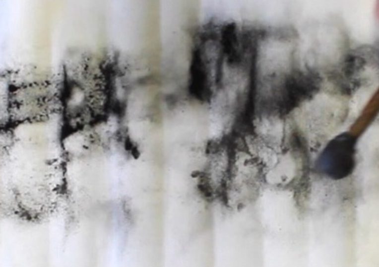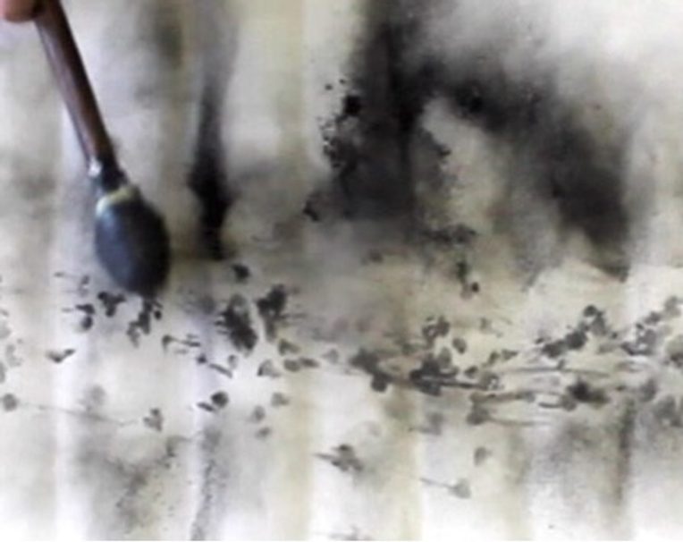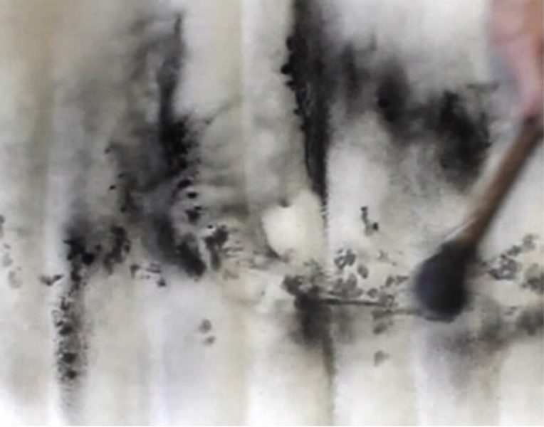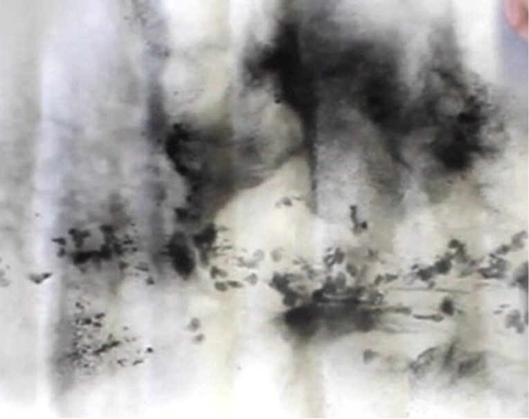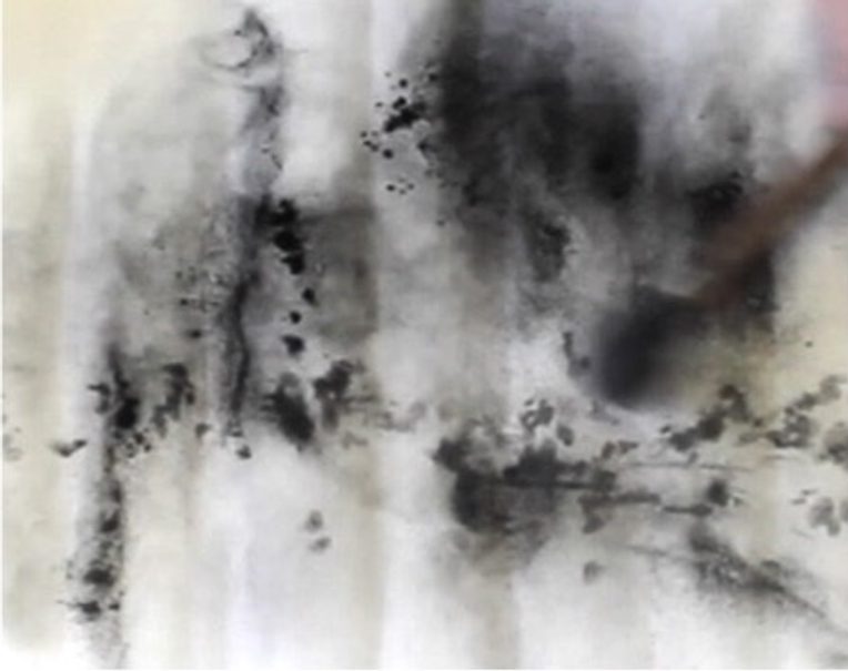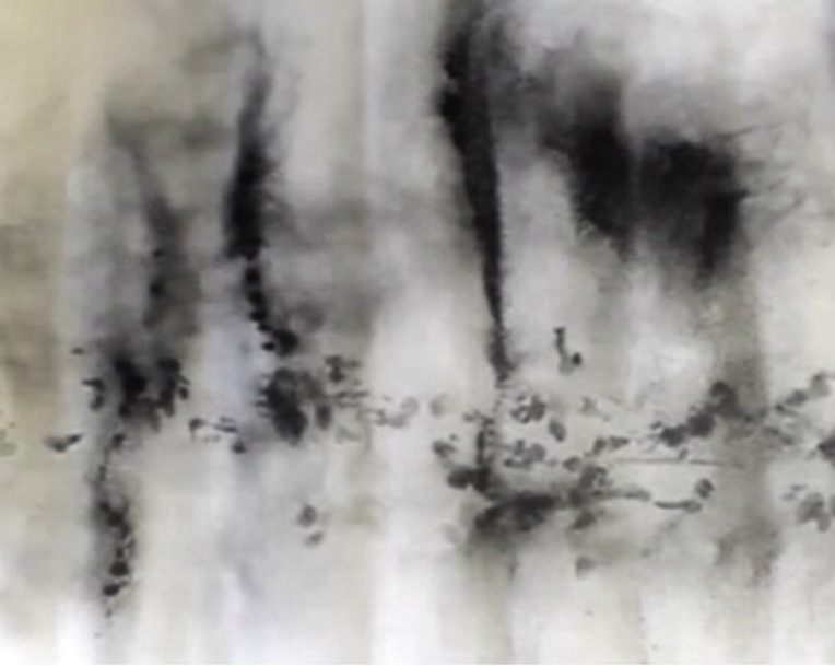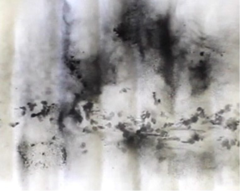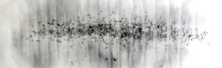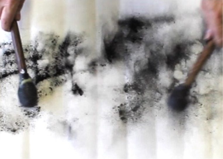 I look to this Asian perspective in order to broach the essence of a piece that was co-composed with a Balafon. The piece was created in the same manner as the various drum pieces except that, given the density of the paper, folds had to be lightly pressed into the surface between the keys for the musician to orient himself. The linear folds became an important structural element in the composing of the piece as they both attracted and repulsed the charcoal powder in their own rhythmic manner, directly affecting the nature of the pigment’s trajectories across the space. As I began to study a sequence of stills from the performance video, I detected formations in the charcoal that were reminiscent of Chinese and Japanese calligraphy. As I proceeded along the sequence the calligraphic characters gave way to morphing landscapes in which clouds seemed to emerge and metamorphose with the circulating air propelled by the forces of resounding sounds and corporeal gestures. The vertical fold structure correlated with the dynamics of gravity both materially (as it pulled the charcoal down into its grounded crevices) and pictorially (as it evoked the vertical tendency of nature’s unfolding). The undulating relief inscribed in the fabric of the paper re-acted as a generative force and as a trace of the rippling turbulence that intervened in the flow of particles and its nebular formations. The very nature of the event of formation seemed to embody the essence of Japanese drawing, both calligraphic and figurative, which to me is a primary source of drawing as corporeal process. And so it is through this lens that I write about this piece, only to intertwine it with western views.