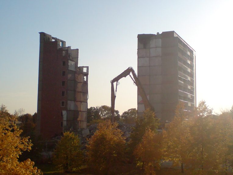 The large-scale destruction of apartment houses in Hoyerswerda-Neustadt, the German Democratic Republic’s former second socialist model city, is in many ways what its citizens have called it: senseless (sinnlos), unfathomable (unfassbar), and utterly mad (verrückt). For some, it seemed as if Neustadt’s built environment was nothing but a colossal sacrifice to capitalism, callously offered on the altar of German reunification. How else to make sense of the ravenous demolition of perfectly intact and liveable houses at a rate matter-of-factly described as “unprecedented in peacetime” (beispiellos in Friedenszeiten). And fair enough: normally, this relentless, piercing, dusty deconstruction of countless apartment blocks is only imaginable in the context of war. Calling it a form of “unbuilding” downplays these attributions as well as the effects it had on Hoyerswerda’s inhabitants.