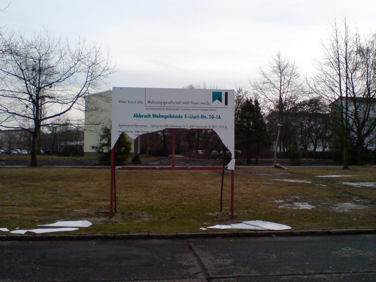 In Neustadt, unbuilding unfolded orderly. Each (un)building site featured an official (un)building sign [see Figure 2] the size of a billboard that informed interested passersby about contractors, funders, and involved companies, the (un)building project’s start and end dates, etc. Under project description, these signs would not say “construction” [Bau] of a certain edifice, but “demolition” [Abbruch]. There is no shame in unbuilding here. And perhaps rightly so?