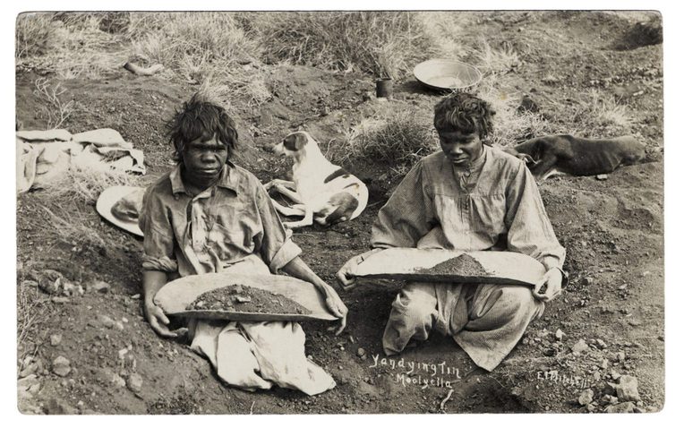 The historical derivation of today’s debates continues to be overlooked by policymakers and corporations, despite their enthusiastic use of Aboriginal culture and heritage in promoting corporate social responsibility programs. One key aspect of these debates is the role that representation has played in shaping popular opinion and public policy. The first Western sightings and images of Australia were made on the continent’s western coast, and perceptions of the West—particularly northwestern Western Australia—have continued to shape debates about national and regional identity, race relations, and Australian culture. Although mining has long been central to Australian notions of national identity as a source of prosperity and development since the mid-nineteenth century, mining narratives—and profits—have usually centered white male heroes. The important role of women and Aboriginal people has remained invisible in these accounts, echoing the historical exclusion of these groups. After tin was discovered in the Pilbara in 1882, Aboriginal people introduced the yandy, a wooden dish traditionally used in winnowing grass seed or other foods, as a tool for panning for tin and gold. Yandying was described over and over with evident fascination, such as when a journalist for the Sunday Times noted on January 18, 1914 that only Aboriginal women had mastered “the inimitable and delicate manipulation of this simple device.