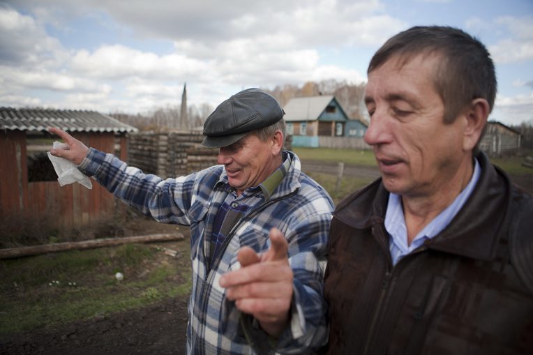 The Osipov brothers, Vladimir and Sergey, on the main street of Bergul. Vladimir (left), the younger one, works here as a tractor driver and lives in the house that was built by their parents. October 7, 2012.