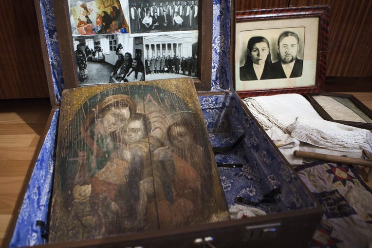 Relics of the Osipov family: the old icon that was brought by their ancestors from Vitebsk province, with photos of their parents and their aunt Anna Belova. In Soviet times, Anna was in charge of the izbachital’nya (a very small local library; literally, a “library shack”). She founded the first Siberian folk group here, which became very famous. October 6, 2012.