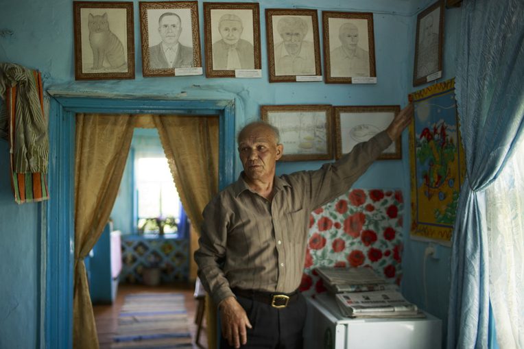 Alexey Starkov in his house in Bergul, presenting a gallery of portraits he drew himself. In 1991, when the Soviet Union dissolved, his mother also fell ill. Alexey, a high-ranking electrical engineer, left his job in Minsk to return to his native village. “There was no more obligation to the country,” he said, “only to my kin.” He cared for his paralyzed mother for five years until her death, and never left home again. June 22, 2013.