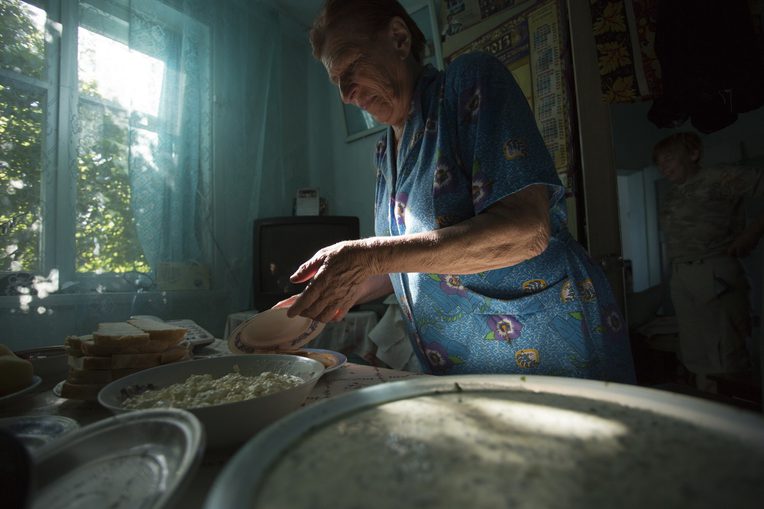 Valentina Ryabtchikova in her kitchen. In the families of Old Believers, descendants preserve traditional recipes as well as traditional words. Valentina regaled us with an explanation of the word ryzyka; the dictionary defines it as risk, boldness, or force. A bit like attitude. She shifts easily from talk to song. We ask, “why it so?” and she answers, “It comes from nature, from God. This is my ryzyka . . . my departed granny Lushka used to say to me: ‘Hey, you heretic, demonic offspring! But I love you for your ryzyka . . .’ Or she would tell me: ‘You, keep your ryzyka inside you.’ June 22, 2013.