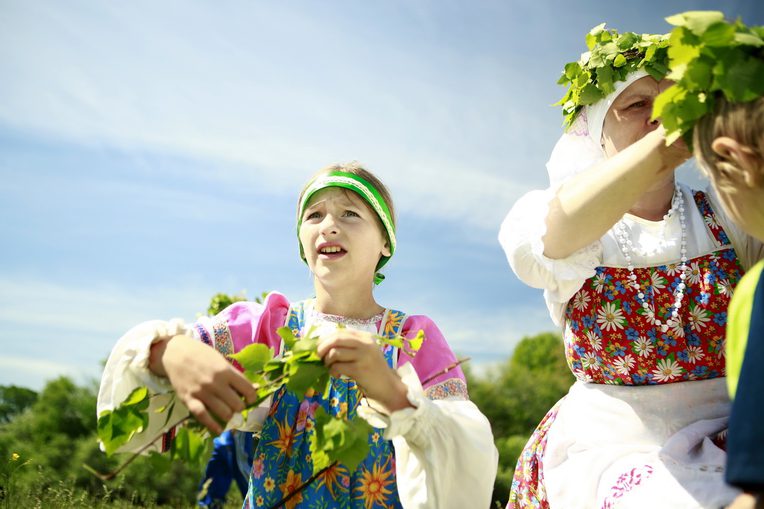 The Orthodox Feast of the Holy Trinity (Pentecost) is the time of the descent of the Holy Spirit, when the elders, being full of sadness and hope, are thinking of the past and the future. Here, members of the folklore ensemble Lenok adorn themselves in wreaths of birch branches, nearby on the banks of the Tara River. June 23, 2013.