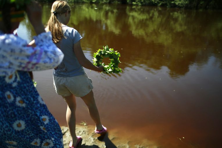 The children's folklore group Lenok was formed in Bergul a few years ago. On Holy Trinity Day, kids play old games. Here, they throw wreaths into the water and wonder about the future. 2013.