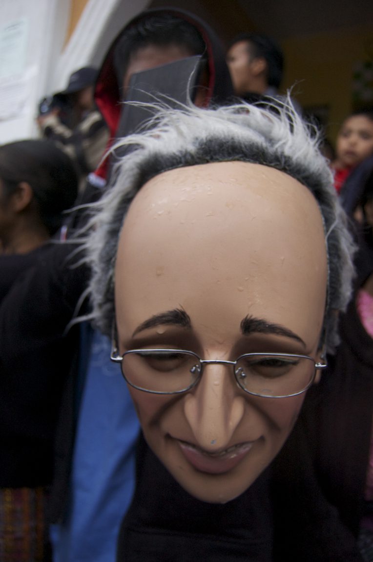 Rhonda Taube: One of the obvious ways in which the characters transform during the dance isthrough their complete removal from their original context as a cartoon character, athlete, political figure, or TV star. Our American sense of corporate logo or “branding” is utterly dropped. That is why Barack Obama may be seen dancing next to Daddy Yankee, Buddha, and Pamela Anderson as Barb Wire. In this sense they activate the difference within the community of those “in the know” and those outside of the cable, internet, smart phone generation. In this way, they really create the recognition of a leisure class within the community, those who have the funds and the time to surf the net, play video games, and watch cable television. Yet, underlying the social opposition is a very Maya understanding of the importance of public performance to celebrate and indicate religious affiliation. The organization of the hierarchy within the dance groups is modeled on the indigenous cofradia system, the religious brotherhood responsible for festivals. In addition, many of the rituals of preparation the dancers undergo, such as a calendar cycle of prayers, abstinence from sex and alcohol, as well as other customs, is quite similar to what the participants traditional dances undergo. The main differences, aside from the costumes, are the narratives traditional dances, as well as the secrecy. What I mean by secrecy is that traditional dancers guard their identities from the public and do not reveal themselves as individuals. The disfraces dancers, on the other hand, publicly remove their masks for individual credit and increased social respect. This reveal, or “discovery,” is indeed the most exciting moment of the performance. I suspect this is so not only for recognition, but also because not much else really happens. The dances are quite monotonous and again, tell no story.