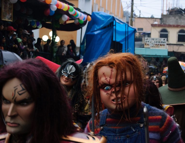 In the muddy market square of Momostenango, Guatemala, where shamans burn offerings in the shadow of the Catholic church, a bizarre spectacle is arriving. Horror movie monsters jostle through the crowd, followed by Mexican pop stars, Japanese game avatars, and dictators from the dark years of the 1980s. Unlike the folkloric performances long studied by anthropologists, the new Disfraz dance won’t show up on any postcard. In some villages, it’s even been banned for the way it frightens tourists. So how did these fiberglass masks of Xena: Warrior Princess come to be blessed in the smoke of Maya altars? Gods and Kings is a film about a little town in the mountains and the great empire to its north, a story of conquistadors, tricksters, sorcerers and advertisers. In a town where Chucky from Child’s Play is a real evil spirit that appears in people’s nightmares, stories are a serious business, and it always matters who’s telling them.