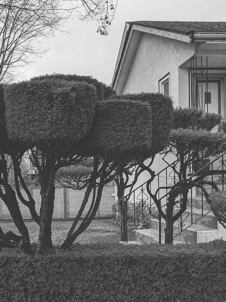 For months now, I have walked four alleys in Vancouver’s Grandview-Woodland neighborhood just south of Commercial Drive, once a skid road that supplied logs to the Hastings Sawmill on Burrard Inlet, now a mix of Afro-Carribean hair salons, co-op and Native social housing, and gentrifying cannabis dispensaries. The streetscape alternates with low stuccoed houses, two or three low-rise apartment blocks, an occasional modernist concrete and glass intervention, Tibetan prayer flags, tarped-over PVC pipe greenhouses or gangly cinder-block gardens, and clipped hedges arching out into the geometry of decades past. At long intervals, sidewalk slabs have been stenciled over with “kill all TERFS” graffiti. On one paint-peeling veranda, a bedsheet tacked to the eaves reads “DECOLONIZE NOW!” scrawled in neon orange construction marking spray.