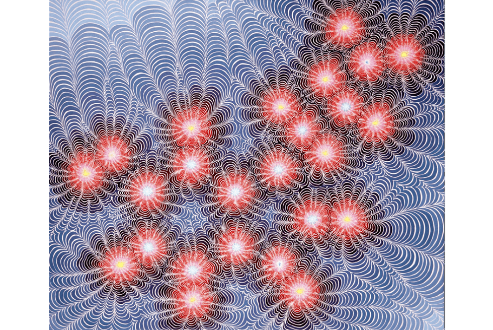 Serotonin is part of a series by artist Kelsey Brooks on psychedelics. The resemblance between the tryptamine psychedelics (e.g., DMT, psilocybin, and LSD) and this essential neurotransmitter is central to their effects on humans. Brooks was a scientist before becoming a professional artist. The print is based on meticulous paintings that began as molecular structures with dots in place of atoms that were then outlined by layers of color. Brooks said about the series, “I like to think of it as a colorful and kinetic representation of the tiniest pieces of our universe and of ourselves.”