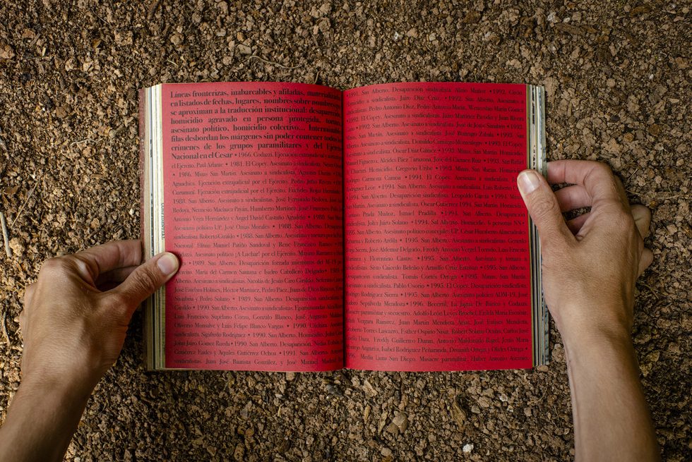 With a new turn of the page and a montage around a corpse, the relay of an indisputable fact: “extrajudicial executions” are only the perfection of a political project of domination decades in the making. In the words of the authors, what follows is “inexpressible.” The first and last names of two hundred ninety-five assassinations committed by the Armed Forces and paramilitaries in Cesar from 1966 to 2011. Six gruesome pages of thick red cardstock crammed with severed lives.