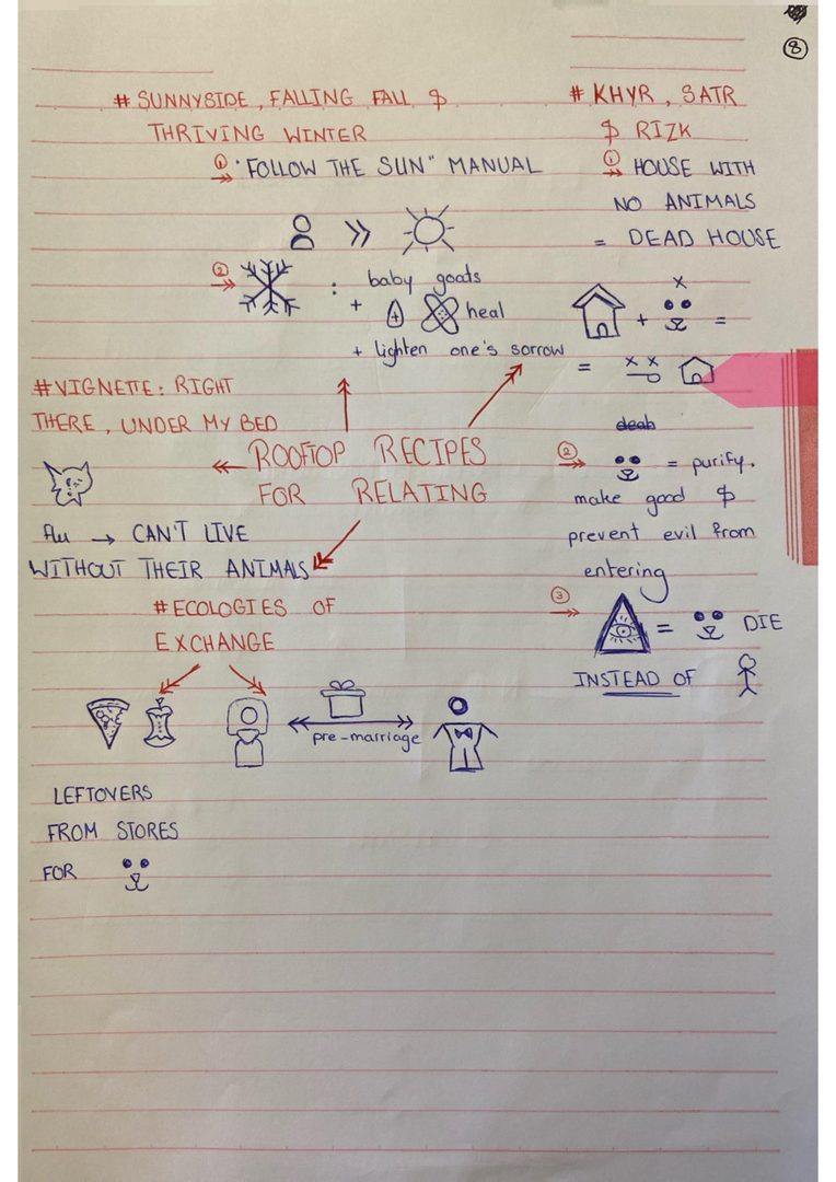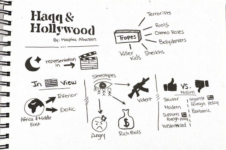 The process of sketchnoting was particularly fit for some of the courses I was teaching in the undergrad core curriculum in 2023-2024 at The American University in Cairo, and aptly constituted a playing field to question taken-for-granted universals and issues of representations: “Arab Society” (through the representation of Arabs and Muslims in Hollywood cinema) and “Kinship, Family, and Friends in Egypt.” The classroom would occasionally include a few minors in anthropology/sociology and a couple of students in graphic design, but most students were here to (often reluctantly) check off liberal arts requirements. I was therefore expecting a wide range of motivations and understandings. In this context, I approached sketchnotes as a tool for practice and thinking embedded in routine and repetition, so to create a comfortable space for students to begin to draw (the assumption being: everyone in the class is terrible at drawing, yours truly included).