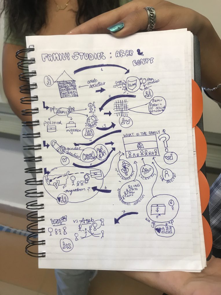 That first meeting of the semester was designed to ease the fears of many students, such as not knowing how to draw, having no clue what a sketchnote is, or where to start with this weekly endeavor, and to demystify the overall process. I found that after the next session students felt more comfortable with the idea of sketchnoting. For the second meeting, there were no “content driven” assigned readings (nothing related to Arab Society / Kinship in Egypt). Instead, the readings focused on sketchnoting to ease into the practice and alleviate the most immediate anxieties. Students read the entirety of Mike Rohde’s The Sketchnote Handbook (2012) which is written in sketchnotes and therefore makes for a quick and playful reading that directly situates the reader in practice. In addition, a recommended reading included Rohde’s The Sketchnote Workbook (2014) which walks the reader through a variety of uses for sketchnotes in daily life. Rohde’s book is well recognized among sketchnoters, but I also chose it because both the handbook and workbook come with video versions, enabling students from a wide range of learning orientations to opt for whatever option they feel more comfortable with. Finally, I put on Blackboard a “legit procrastination” section with blog posts and quick YouTube videos, all on sketchnoting.