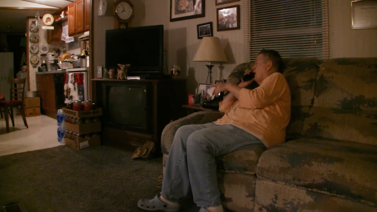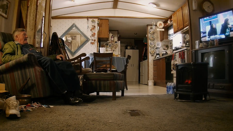 Within the scope of the film, the phone conversation leads nowhere in particular; we never find out who is on the other side of the line, nor do we get to enjoy the sight of Opal’s homemade cornbread. Instead, Opal and Lee’s chores and hopes and histories are depicted for their own sake, underscoring the fact that lived experience has more wrinkles than categories. Linefork is thus an exercise in sparseness, in its composition of the everyday with all of its promise and quirks. At one point, The Jerry Springer Show dominates the couple’s living room, and its uncontrollable sonic rampage stands in stark contrast with the subdued and amicable conversations and affections between Opal and Lee. Other filmmakers might have deemed the sequence unusable because of the audible TV program, but Silva and Rawlings wholeheartedly make room for ethnographic details of this sort. The dramatic and roaring presence of the reality show not only proposes a tonal counterpoint to the Sextons’ decades-long relationship, but also echoes a pivotal sequence in Lucien Taylor and Véréna Paravel’s Leviathan (2012). There, it is the fishing vessels of the show Deadliest Catch that appear on a television screen. In both Linefork and Leviathan, the metapresence of TV shows serve as intertext and as comic relief.