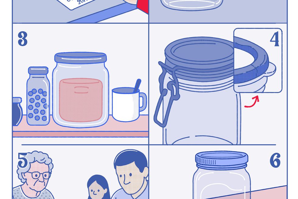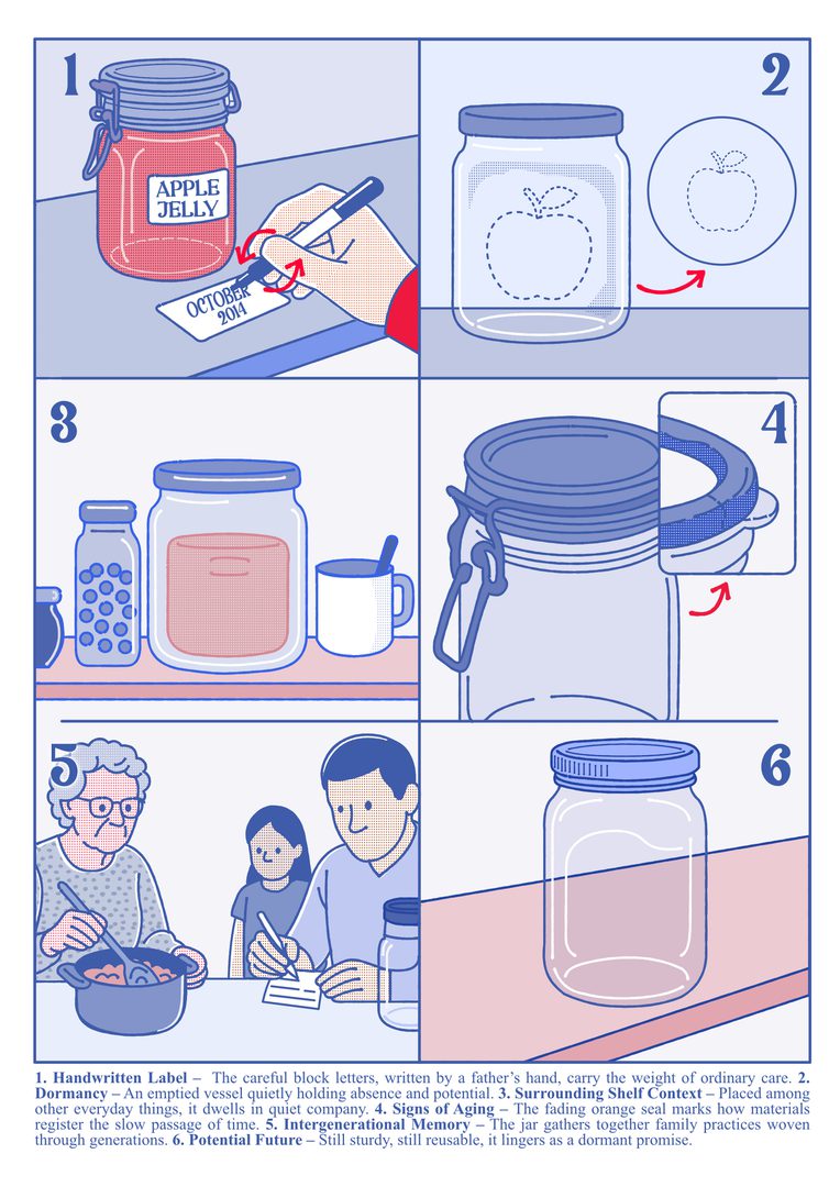 The jam jar—contributed by Sophie Woodward—offered a useful test case because its significance in the essay lay less in what it did than in how it remained: dormant, ordinary, and yet still charged with care. The object was an empty Kilner-style jam jar on a kitchen shelf, with a metal clip lid, a fading orange rubber seal, and a handwritten label reading Apple Jelly, October 2014. On my first readings, I noted more elements than the final sequence could hold: form, label, shelf placement, emptiness, aging materials, possible reuse, and family memory. What eventually emerged were six illustrated panels: handwritten label, dormancy, surrounding shelf context, signs of aging, intergenerational memory, and potential future. Instead of showing how the jar functions mechanically, the manual had to diagram a more difficult condition: its suspended function.