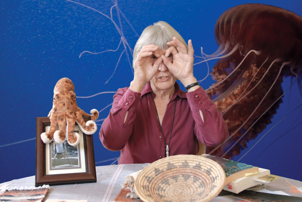 Yet Terranova’s depiction is not a mere biographical portrait. Just as we might begin to mistake it as such, filmic techniques step in to subvert it, returning us to the titular task of storytelling for earthly survival. Even as we are offered glimpses into Haraway’s everyday, we are equally drawn into the playfulness of Haraway’s world: its randomness, its stochasticity. Superimposed images of octopi, cyborg dogs, tentacular tendrils, and even text reminding us that “we are all lichens” flash across these place-settings, pushing cinema verité into the realm of the surreal while staying anchored in a strong sense of situatedness. Close-up shots of Haraway conversing with Terranova, made with a handheld technique that evokes “being there,” are jolted by a giant jellyfish that appears in the corner of the frame, pulsing, its electric tendrils extending behind Haraway’s chair. Haraway continues speaking, unfazed. We get the sense that she is equally complicit in and inured to these “companion species” (Haraway 2003), as if they are housemates going about their own business.