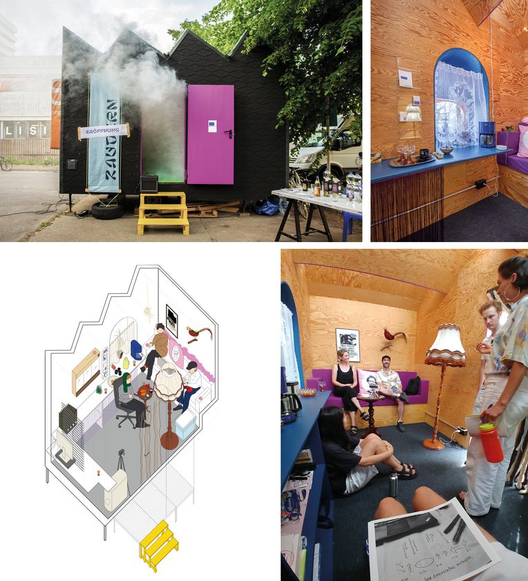 The Zauderbude—literally a “booth for dithering”— was the key field device we created in a research project investigating conflicts and equivocations within a collaboration between public administration officials and urban activists in Berlin (Farías, Marlow, and Wall 2024). We focused on two so-called “Model Projects of Cooperative Urban Development Oriented to the Common Good”: the Haus der Statistik and the Rathausblock Kreuzberg. These two building complexes are undergoing all-encompassing urban renewal processes, in which civil society organizations co-manage the projects alongside public administration. Additionally, these teams coordinate temporary cultural uses during the redevelopment phase. Of particular note is the Haus der Statistik, which has become one of Berlin's most vibrant cultural hubs, hosting numerous discussions and experiments centered on envisioning the city's future.