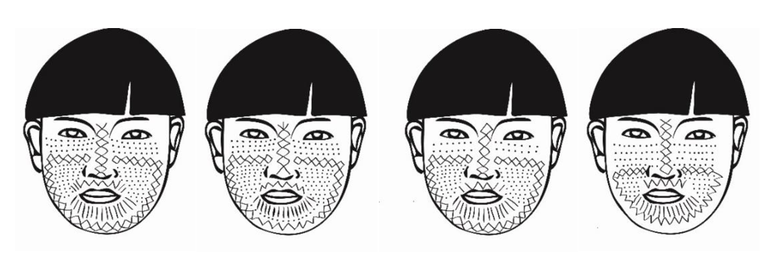However, there was no requirement for the facial tattoo to be performed by a woman in a specific kinship position: the tattooist/tattooed relationship did not mirror the orientation of cross-cousin marriage prevalent in this society. Also, it became obvious that the limited geometric patterns of the tattoos were not intended to function as a symbolic system (if they ever did, this has been lost). The patterns were very stable and executed with only minor variations, a constancy paralleling the permanence of the tattoo itself (see Figure 1). Something else was going on between women, through the medium of the skin as a space of their own.