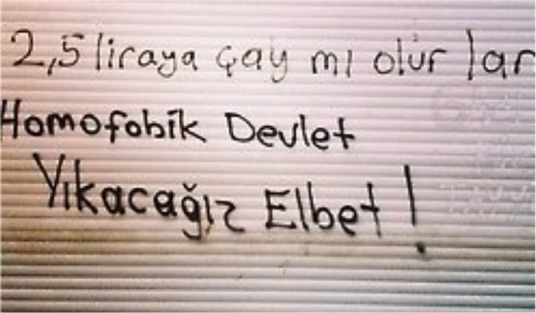 Explicitly political expressions were followed by those aiming to boost morale in the face of police violence. Revolutionary battle cries stood next to iconography of Mustafa Kemal (Atatürk) and its inversions. “We are Mustafa Keser’s soldiers,” took the figure of a popular Arabesque singer to counter the nationalist slogan “We are Mustafa Kemal’s soldiers.” Critiques of rising costs of living and of homophobia shared the same walls (image 3). Contrary to the usual rules of graffiti, in which competing groups write over those of others (often referred to as “crossing out”), only writings that entailed sexist expressions were modified during an initiative led by the Socialist Feminist Collective.