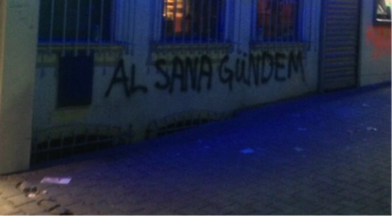 This density of explicitly political and pop-cultural expressions did not just articulate, but actually produced, a suspension of the limits of the sayable, a moment that pushed actively against the delegitimization and circumscription of the state. While such moments have an undeniable attractiveness, political change is contingent upon their sustainability, upon adding moments onto a moment, to allow for alternative discourses—and politics—to develop. In the streets of Beyoğlu, the gray paint covering up these slogans is slowly filling up again and new Gezi-related graphics circulate online every day. If they will be able to make the connections between different rights-struggles outside of the avenues accorded to them (images 8 and 9; see Schafers & Ilengiz) or revert to exclusionary fault lines, remains to be seen.