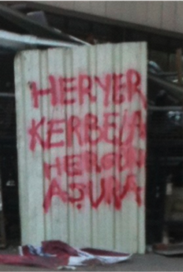Next to a section of the Gümüşsuyu barricade, two-hundred meters from Taksim Square, reading “The drama of the TOMA” (the anti-riot water canon vehicle rumored to be unable to surpass even the lowest obstacles) and on top of the word love (most probably put there by the LGBT block who fought at the frontlines—a shorthand for all love is equal)—a graffiti proclaimed: “THIS IS SPARTA” (image 6). Taking the signature line from the Hollywood blockbuster 300, this nod to popular culture projected, with all its irony, undefeated-ness at a location where police violence had been especially vicious. Facing it, another barricade was inscribed, “Everywhere is Kerbela, everyday is Asura” (image 7). This slogan refers not just to the historical foundations of Alevism and the geographical site of Kerbela. It also cites the festival of Asura, commemorating this plight, as a prism through which Alevi oppression (in the past and the present) as well as their struggle for recognition is frequently voiced (Sökefeld 2008, 130).3